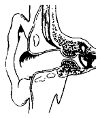 | サ−ファ−イア−になっている人の耳の断面図 サーファーズイアー:骨腫。冷たい水と空気に対する反応として著しい骨腫の 典型である骨の成長を示す外耳道。 |