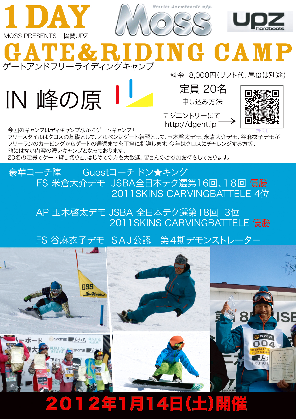 定員20名での貸し切りゲートキャンプを行います。コ−チはAP 玉木 啓太デモ 、FS米倉 大介デモ、谷 麻衣子デモ 、guset ドン☆キングを迎え少人数でゲートを1日貸し切りレッスン!!ゲートに入った事のない方、フリーランを教わりたい方、等など少人数ならではのとても濃〜い練習ができます。1月14日(土)は峰の原へ集合です。 申し込みは